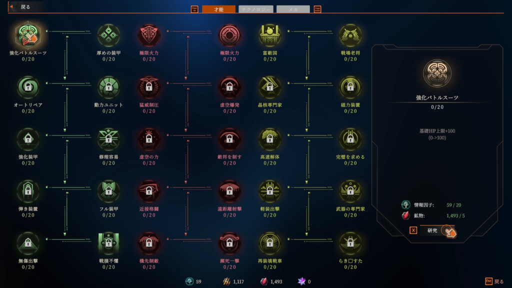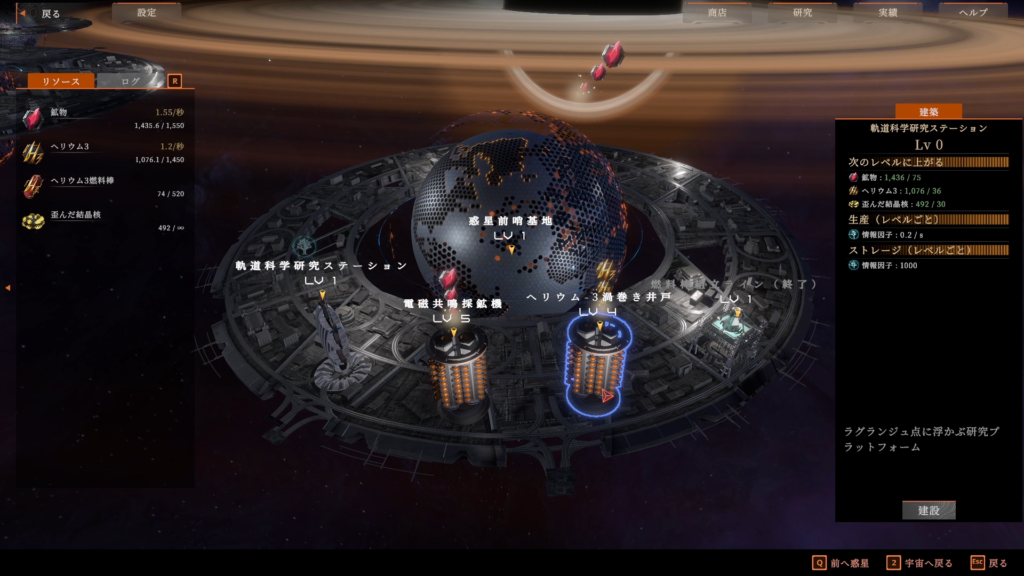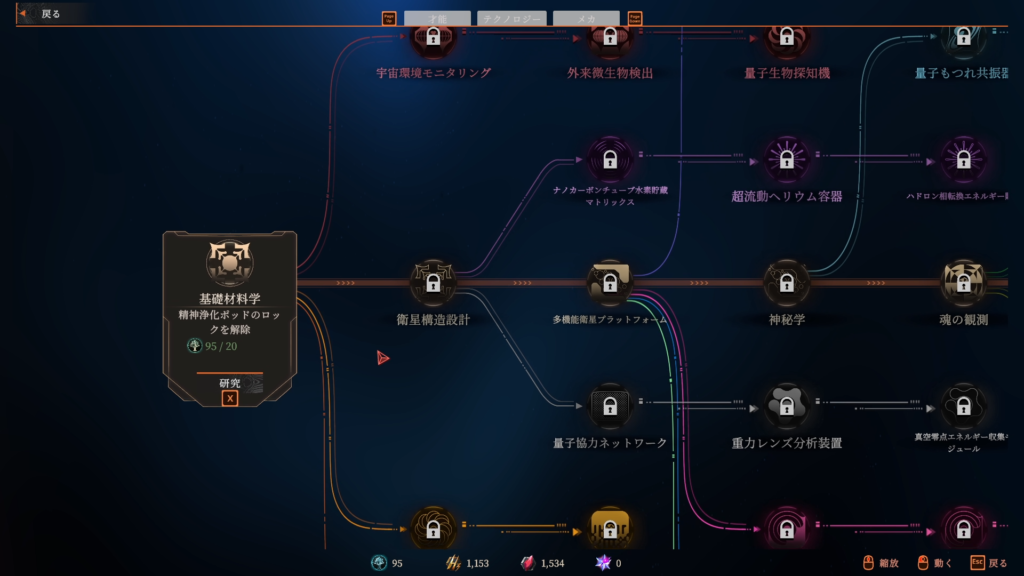 他にもスキルツリーを開放したり、建造物を増やすための研究にも使用できる。