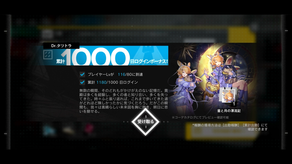 始まるや否やこんなものが。どうやら今日で累計1180日目のログインらしい。クルースの衣装がもらえた。